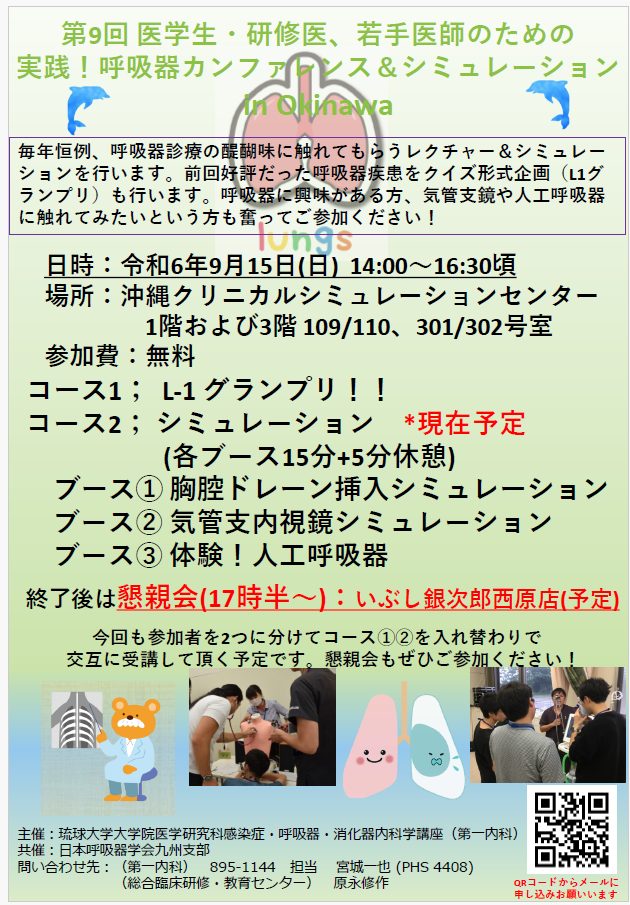 9月15日(日)、14時より沖縄クリニカルシミュレーションセンターで『第9回 医学生・研修医、若手医師のための実践!呼吸器カンファレンス&シミュレーションin Okinawa』を今年も行います!