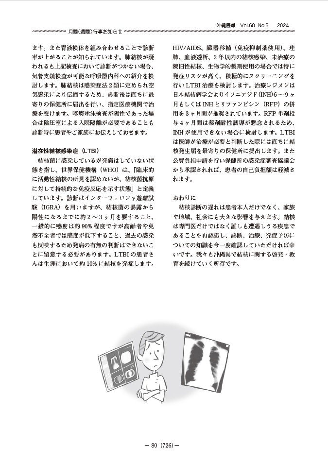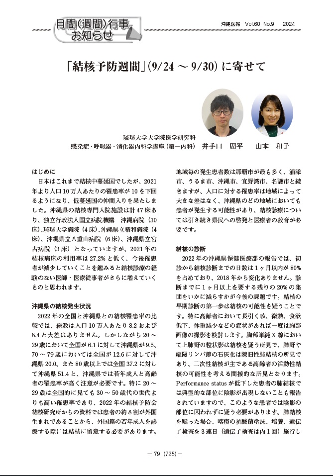当講座 井手口 助教/山本 教授の記事が沖縄県医師会報に掲載されました 2024.10.01 / 論文・図書 先日発刊された沖縄県医師会報Sep,2024に、当講座の井手口周平助教および山本和子教授の記事が掲載されました。同雑誌は沖縄県内の各病院や医局などでご覧になられているかと思いますが、『結核予防週間(9/24~9/30)に寄せて』という表題で、沖縄県の結核発生状況や潜在性肺結核症に関してわかりやすく端的に説明しています。同記事を下記にも掲載しますので、ぜひ御一読ください!*HPへの掲載にあたり同雑誌への許可を得ています*HP掲載の都合上、JPEG画像となっております